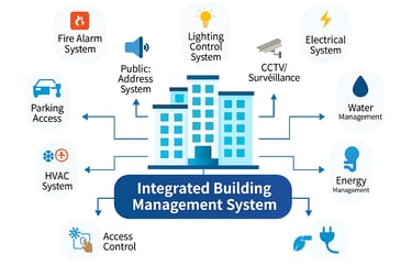 An Integrated Building Management System (IBMS) unifies control of HVAC, fire alarms, lighting, security, access, and other building systems under one platform. It enhances comfort, safety, energy efficiency, and operational oversight.