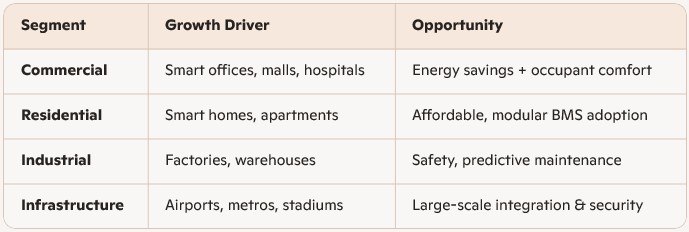 Energy Management Priority: Rising energy costs and sustainability goals are pushing adoption of BMS for HVAC, lighting, and power optimization.
